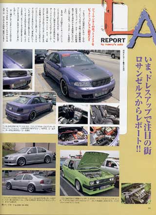 いま、ドレスアップで注目の街ロサンゼルスからレポート! 写真&レポート●清水浩司 ジャーマンカーのホットメイクをピックアップしてご紹介だ!! ドレスアップの世界は、今やワールドワイド。というわけで、 今回、三重県鈴鹿市にあるショップ、メニーズオートの代表 清水サンが5月末から6月初旬にかけていったロサンゼルス、 L.Aレポートをお届けしたい。 |
